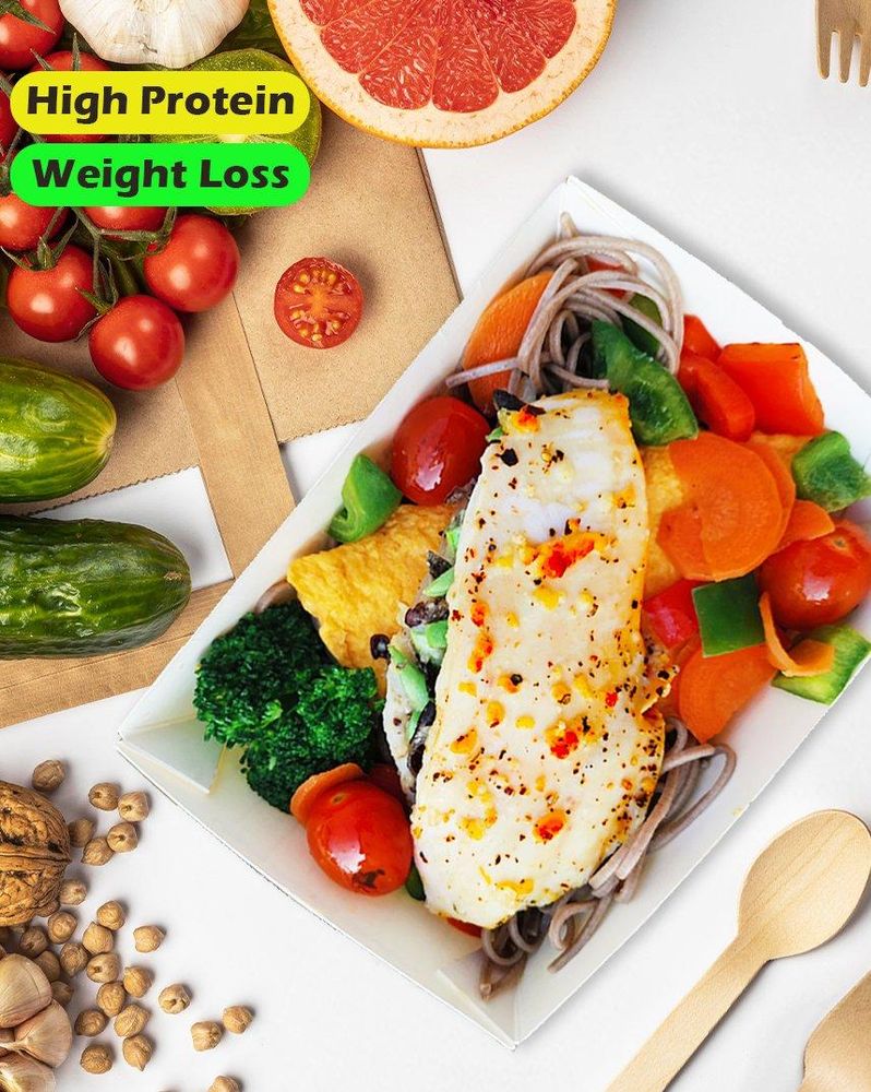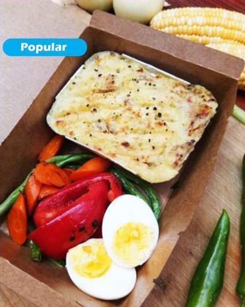 Creamy but low calorie milky fish pie, a luxurious and guilt-free. Our fish pie is made with perch, carrot, celery, low-fat milk, egg and mashed potato. We serve this baked milky fish pie with extra protein and fibre: soft-boiled egg, grilled carrots, string beans and bell pepper!