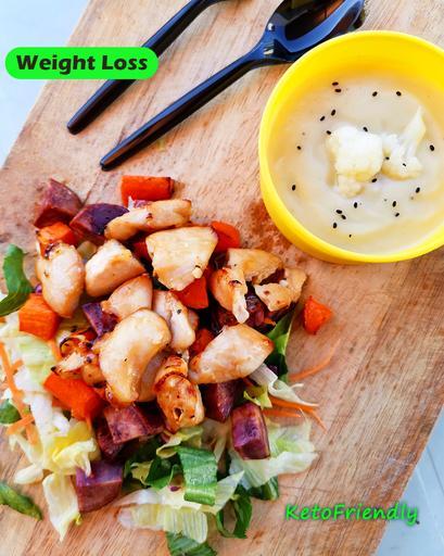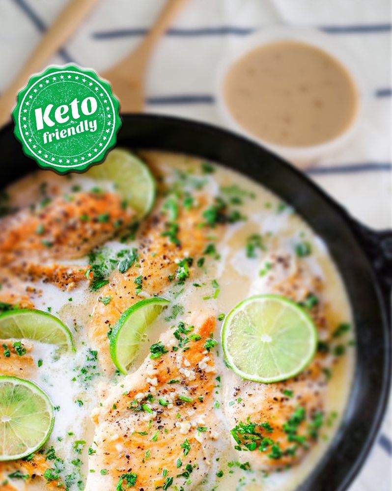 Creamy coconut milk lime chicken, comes with sauteed veges, egg, salads, and cauliflower rice.