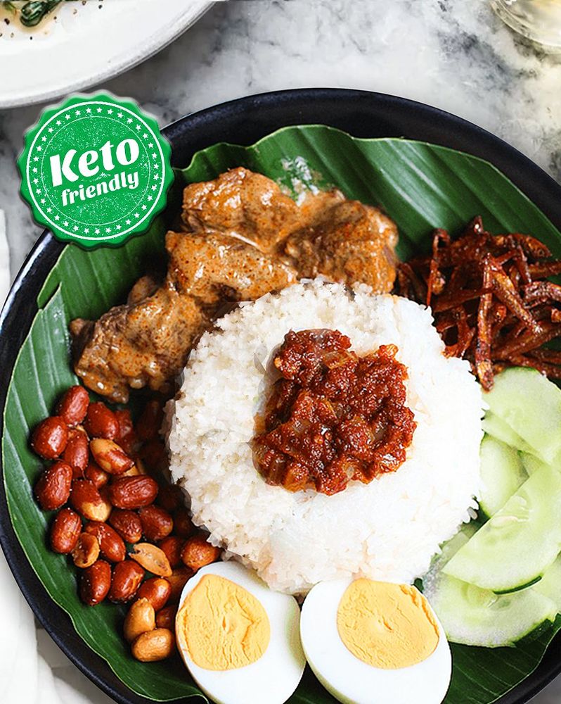 Rendang chicken, keto sambal, comes with santan cauli rice, eggs, peanuts and ikan bilis.