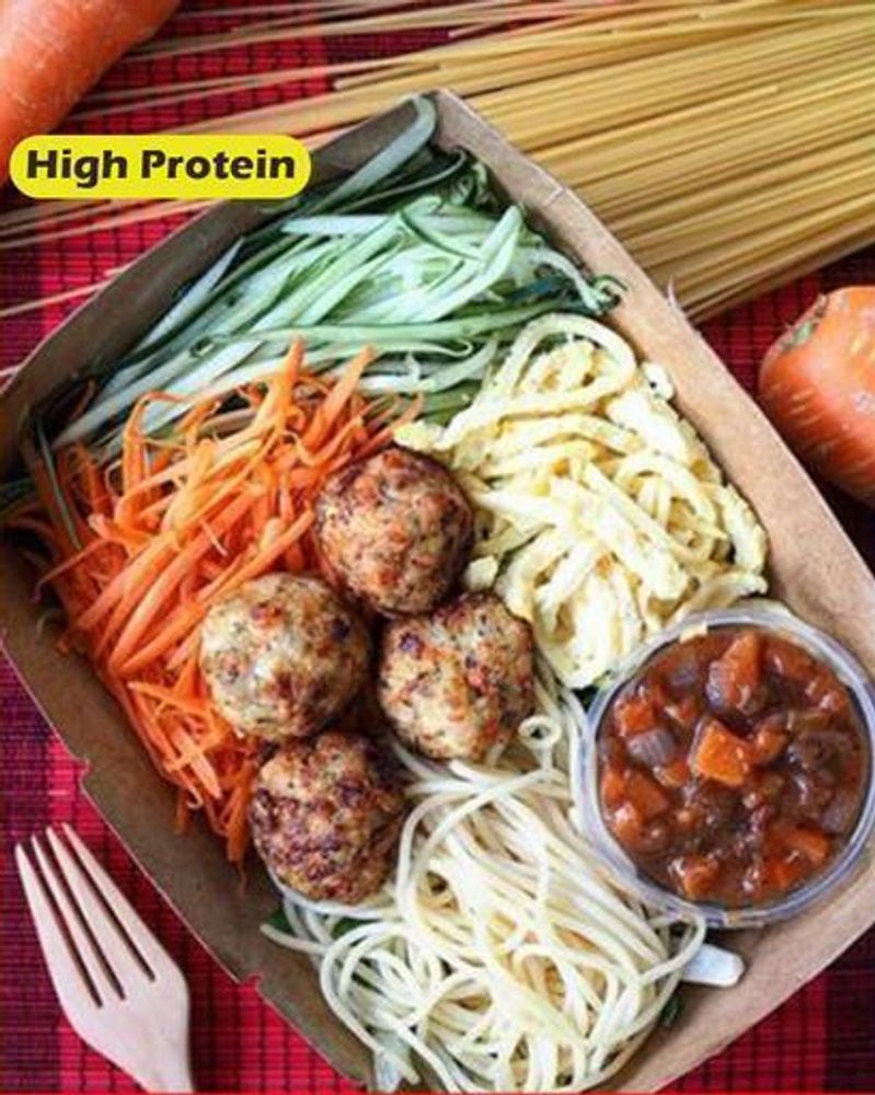 Oven baked meatball, spaghetti, japanese cucumber, carrots, cherry tomatoes, eggs, and basil tomato sauce.
