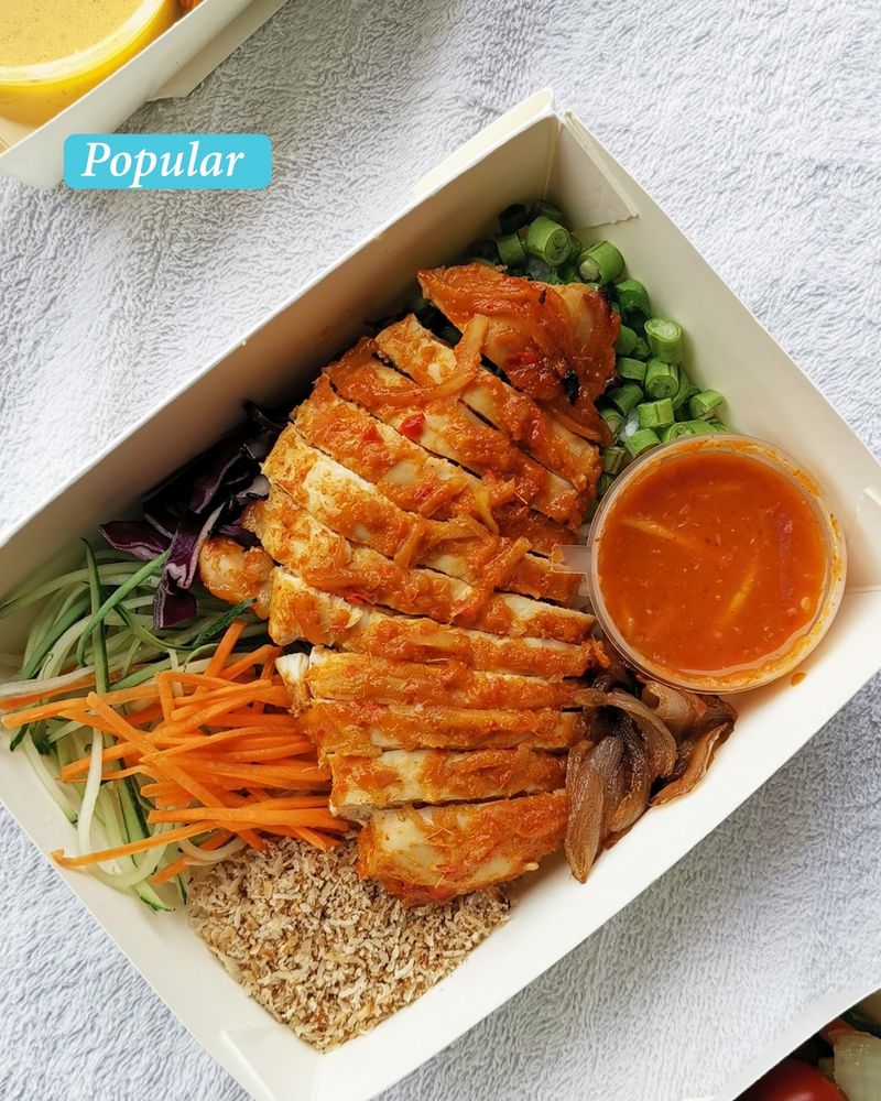 Thai spicy mango chicken, an authentic thai dish that brings you back to Thailand. Roasted coconut floss, butter rice, raw cabbage, cucumber, carrot floss, long beans and caramelized onions are added to the dish for more nutrients and savour.