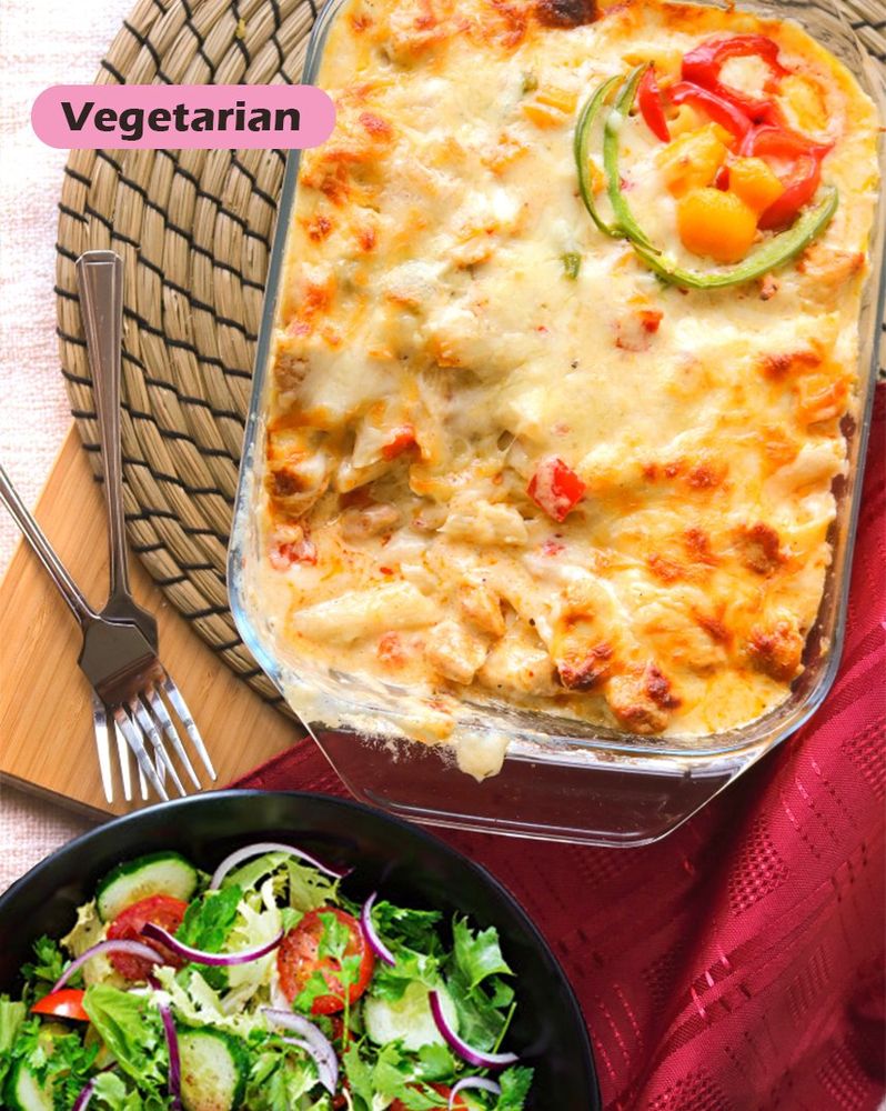 A hearty baked pasta with layer of vegetables and Béchamel sauce, topping with parmesan cheese; is one of the classic cuisine like macaroni or Pastitsio. Silky, creamy, aromatic pasta, serve along with balsamic tossed salad. Balanced, nutritious, tasty vegetarian dish is just a simple click! order now!